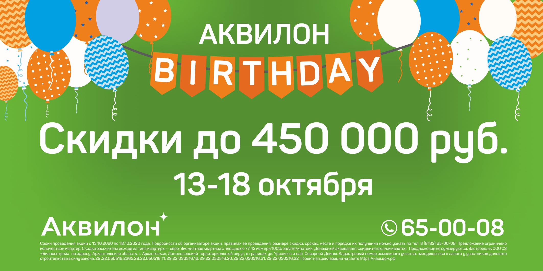 13-18 октября клиентам предоставляется скидка в сумме до 450 тыс. рублей на покупку квартир в Архангельске и Северодвинске. 13 октября центральный офис компании на ул. Попова, 14 в Архангельске и офис в Северодвинске на ул. Ломоносова 85 к. 1 будут работать с 11.00 до 20.00.